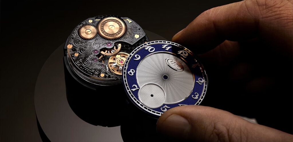 - Anglage—the art of hand beveling. A meticulous process that softens every edge into a gleaming mirror-polished chamfer. More than a decoration, it brings light and life to the movement’s architecture, requiring endless patience and the practice hand of a true watchmaker.