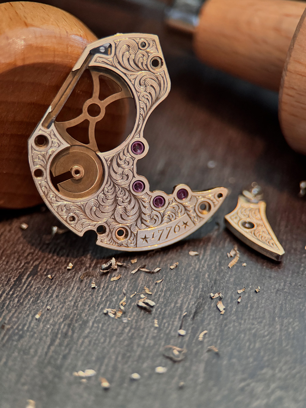 - Hand engraving, a true métier d’art demanding precision patience and years of mastery. With a graver, we carve flowing scrolls, intricate logos, and delicate inscriptions that catch and reflect light, giving each piece depth brilliance, and soul that no machine can replicate.
