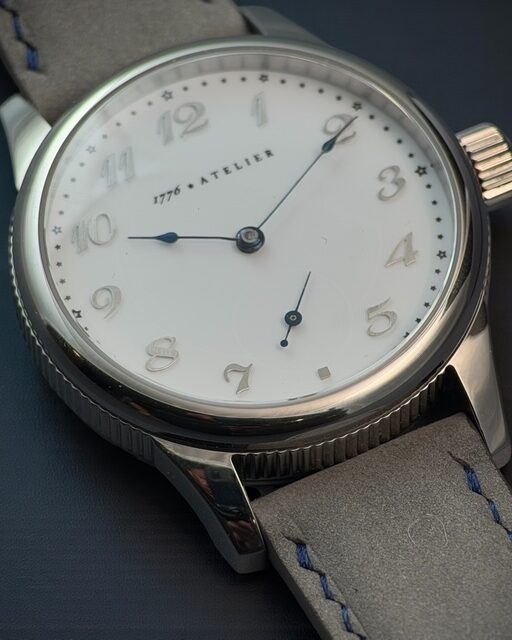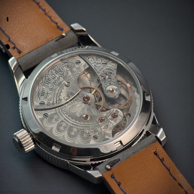 This historic Waltham timepiece was originally completed in 1900 in Waltham, Massachusetts, and features one of the company’s proprietary 16-jewel movements, beautifully finished with intricate damaskeening beneath a traditional three-quarter plate. The original hands have been carefully preserved and restored using thermal bluing—a precise, hand-applied technique that enhances both their deep hue and corrosion resistance. The original dial has been replaced with our own proprietary enamel dial—one of the defining trademarks of our conversion work and a key detail that sets our pieces apart from other offerings in the marketplace. Raised Breguet numerals, finished in a brushed metallic tone, provide contrast and dimension, echoing the sheen and texture of the stainless steel case while introducing subtle modernity. Twelve stars mark the hours around the numerals, while a thirteenth, embedded within our signature, serves as a quiet tribute to the original thirteen colonies and the founding ideals of 1776. To enrich the enamel’s surface, we have introduced delicate etching around the subdial and central area—an understated texture that gently disrupts the luster, adding depth and visual interest without overwhelming the design. Housed in a 40 mm surgical-grade 316L stainless steel conversion case, the watch offers an ideal fit for nearly any wrist. With both crown and caseback gaskets, it is water-resistant to 50 meters, though we recommend avoiding prolonged water exposure. Fully serviced and thoughtfully restored, this timepiece bridges over a century of American craftsmanship and is ready to accompany you on your next chapter.