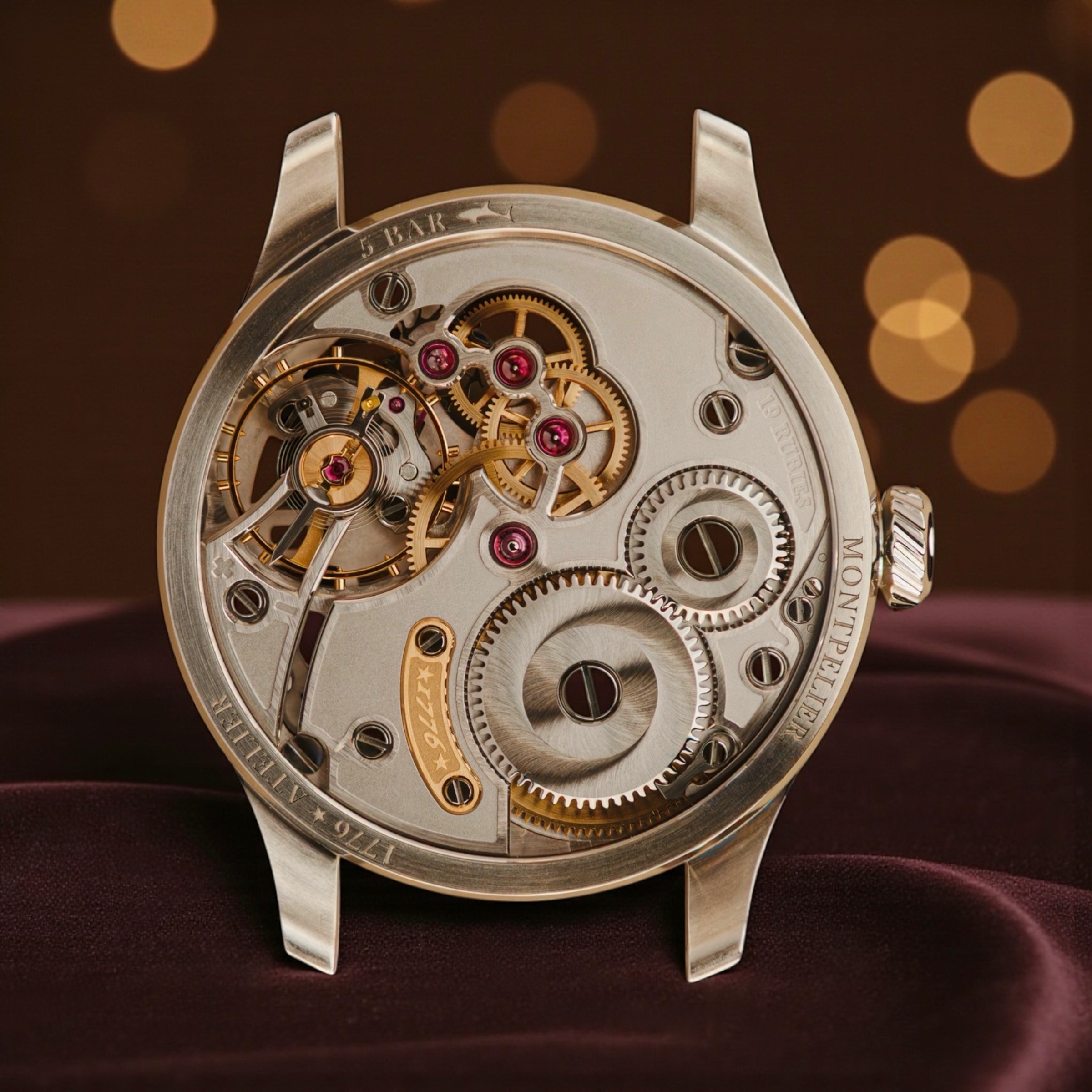 The Montpelier’s case is sculpted from 316L stainless steel, measuring 41 millimeters in diameter and only 10.2 millimeters in height. The concave bezel flows seamlessly into chamfered lugs, creating a continuous, fluid silhouette. The spiral-fluted crown echoes the geometry within the movement, completing the dialogue between form and function.